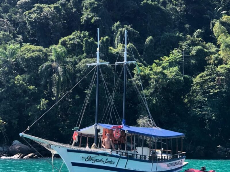 A escuna possui amplo espaço para circulação, áreas cobertas e descoberta, garantindo conforto durante todo o passeio. A navegação já faz parte da experiência, com vistas incríveis do litoral e do mar aberto enquanto seguimos de ilha em ilha.