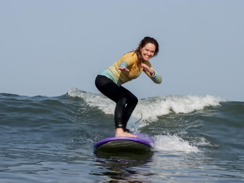 Chega a hora de viver a sensação mais marcante da aula: levantar na prancha. Com o instrutor acompanhando de perto, cada onda vira cumplicidade, cada conquista vira celebração, e cada tentativa rende risadas, apoio e aquela sensação gostosa de parceria verdadeira.